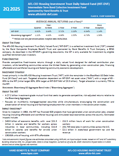 The HIT-DVF invests primarily in the AFL-CIO Housing Investment Trust (HIT), a mutual fund with a 40-year track record of earning competitive fixed income returns while financing affordable and market-rate housing creating good-paying union construction jobs, and strengthening communities across the US. 1